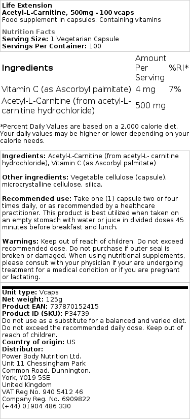 - Zawartość: Każda kapsułka zawiera 500 mg acetylo-L-karnityny.