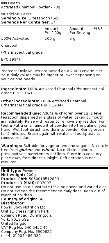 KIKI Health – Activated Charcoal, Powder to naturalny produkt wykonany z aktywnego węgla pochodzącego z łupin kokosów. Ten proszek jest zaprojektowany, aby być wszechstronnym dodatkiem do Twojej codziennej rutyny i może być używany na różne sposoby, aby poprawić Twój styl życia.