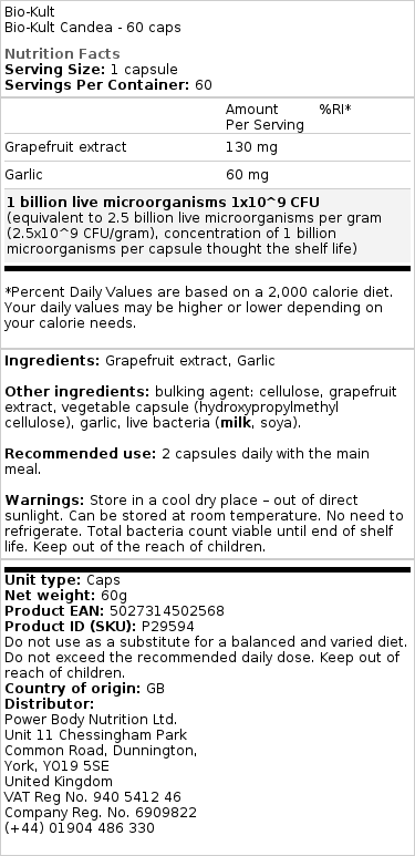 Bio-Kult Candea łączy żywe kultury bakterii z naturalnymi właściwościami wzmacniającymi czosnku i ekstraktu z grejpfruta. Te składniki współpracują ze sobą, aby promować zdrowy balans jelitowy i przyczynić się do codziennego samopoczucia.