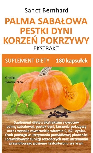 Opis produktu: Odkryj naturalne składniki w formie wygodnych kapsułek. Suplement diety zawiera ekstrakt z owoców palmy sabałowej, pestek dyni oraz korzenia pokrzywy.Produkt jest wzbogacony o witaminę C, cynk i witaminę B2.