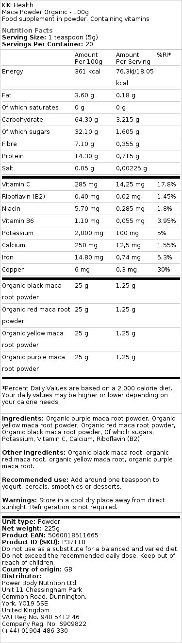 - Wyprodukowany z wysokiej jakości maca uprawianej w Peru.