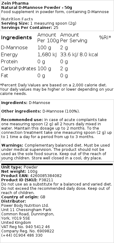 Odkryj korzyści płynące z naturalnego proszku D-Mannose od Zein Pharma. Nasze opakowanie 50g to czysty i skuteczny sposób na wspieranie Twojego ogólnego samopoczucia.