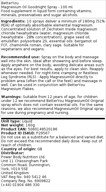 Robi dokładnie to, co mówi, obiecuje dobrą noc i chłopak to zapewnia. Kupiłem ten produkt od Better You, ponieważ mam wiele ich produktów, zwłaszcza produktów magnezowych i zawsze jestem pod wrażeniem ich zalet. Ten nie jest inny. Spryskuję tym mięśnie, które są trochę zmęczone lub napięte przed snem i rano czuję znaczną poprawę. Doskonały